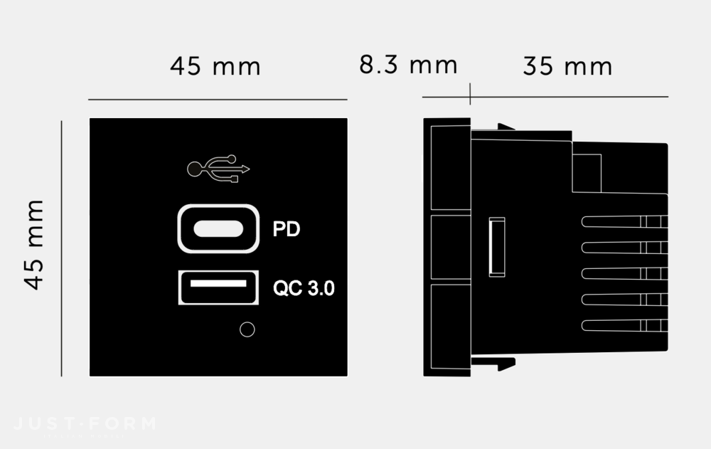 Модуль USB зарядки Buster + Punch USB Module / USB A + C Quickcharge / 45 mm устанавливается в рамки Wall Plates / No Infills коллекции EU Electricity и позволяет скомпоновать устройство с произвольным набором выключателей, диммеров, розеток или других механизмов. Дополнить композицию помогут декоративные винтовые головки в пяти отделках. Модуль с зарядными портами USB Type A + Type C, 5 В 1.5 А каждый. Вход: 100–250 В~ / 50–60 Гц / 0.5 А. Выход: 5 В DC 3 А, 9 В DC 3 А, 12 В DC 2.5 А, 15 В DC 2 А, 20 В DC 1.5 А. Общая выходная мощность: макс. 30 Вт. Потребление в режиме ожидания: макс. 0.1 Вт. Черный или белый цвет.