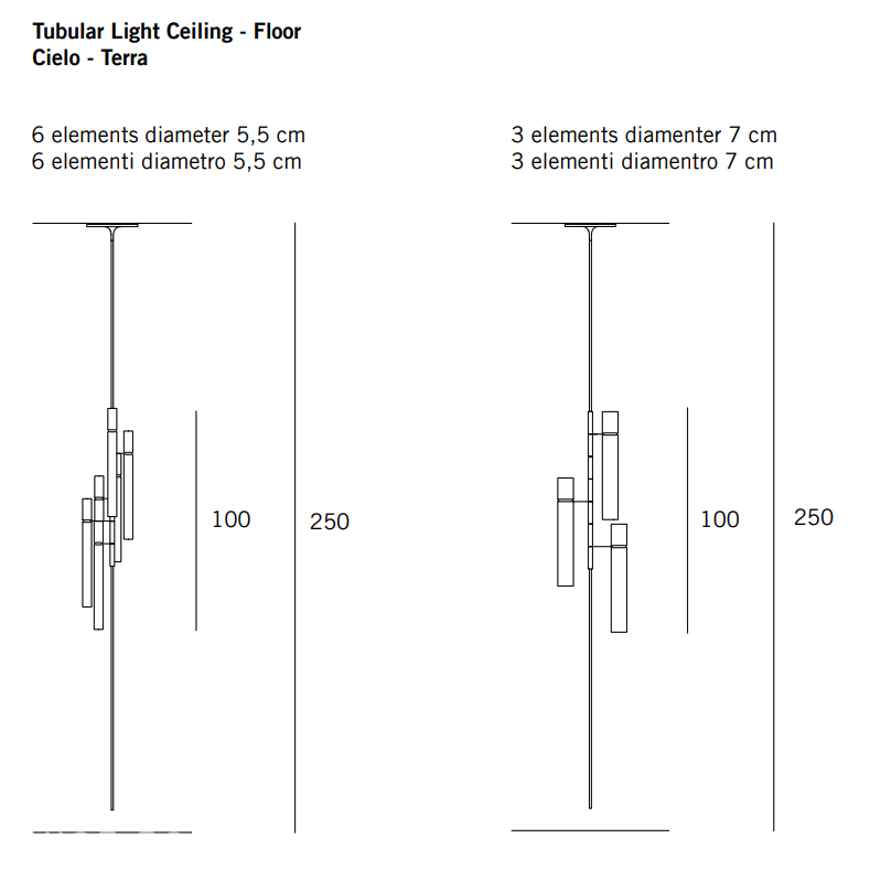 Торшер Tubular Light Ceiling - Floor представляет собой длинную металлическую штангу длиной 250 см, опускающуюся с потолка почти до самого пола. Торшер излучает свет в двух направлениях - вверх и вниз. Корпус выполнен из отполированной вручную латуни. Источниками света служат 18 светодиодных ламп: 18 х 18 Вт; 3500 К.Выпускается в двух версиях - с тремя светильниками диаметром 7 см и с шестью светильниками диаметром 5,5 см.